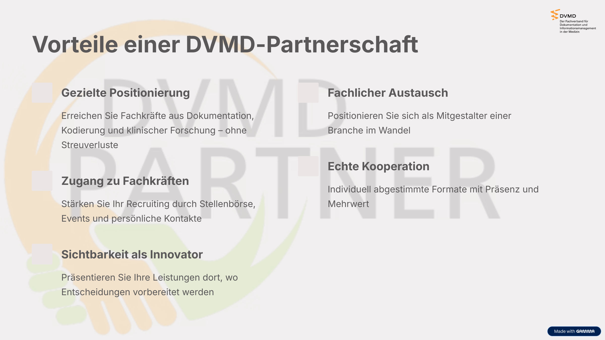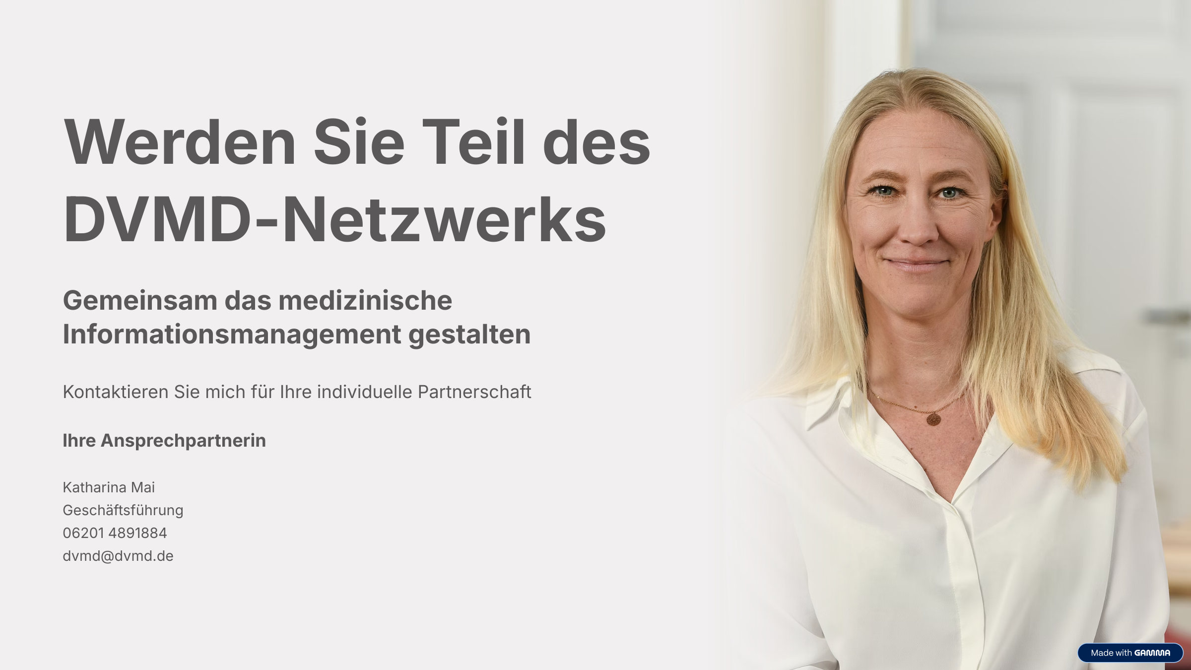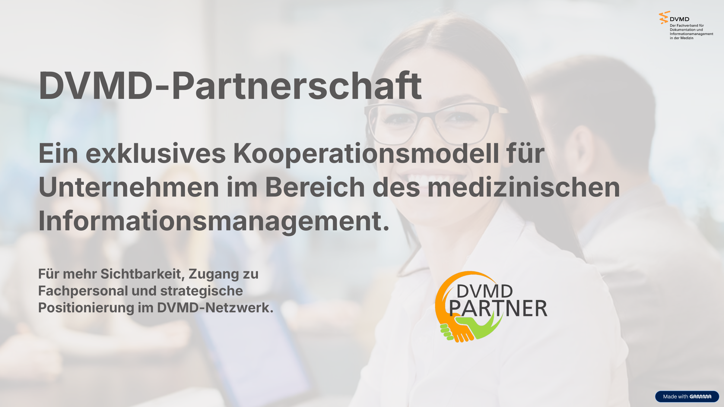 Für Unternehmen, die im Umfeld von medizinischen Daten, Forschung, Kodierung oder Dokumentation tätig sind, bietet der DVMD ein partnerschaftliches Beteiligungsmodell. Die DVMD-Partnerschaft richtet sich an Anbieter, die fachlich sichtbar werden, konkrete Zielgruppen erreichen und sich inhaltlich positionieren möchten – sei es durch eigene Veranstaltungen, thematische Impulse oder direkte Kommunikation mit Fach- und Nachwuchskräften.