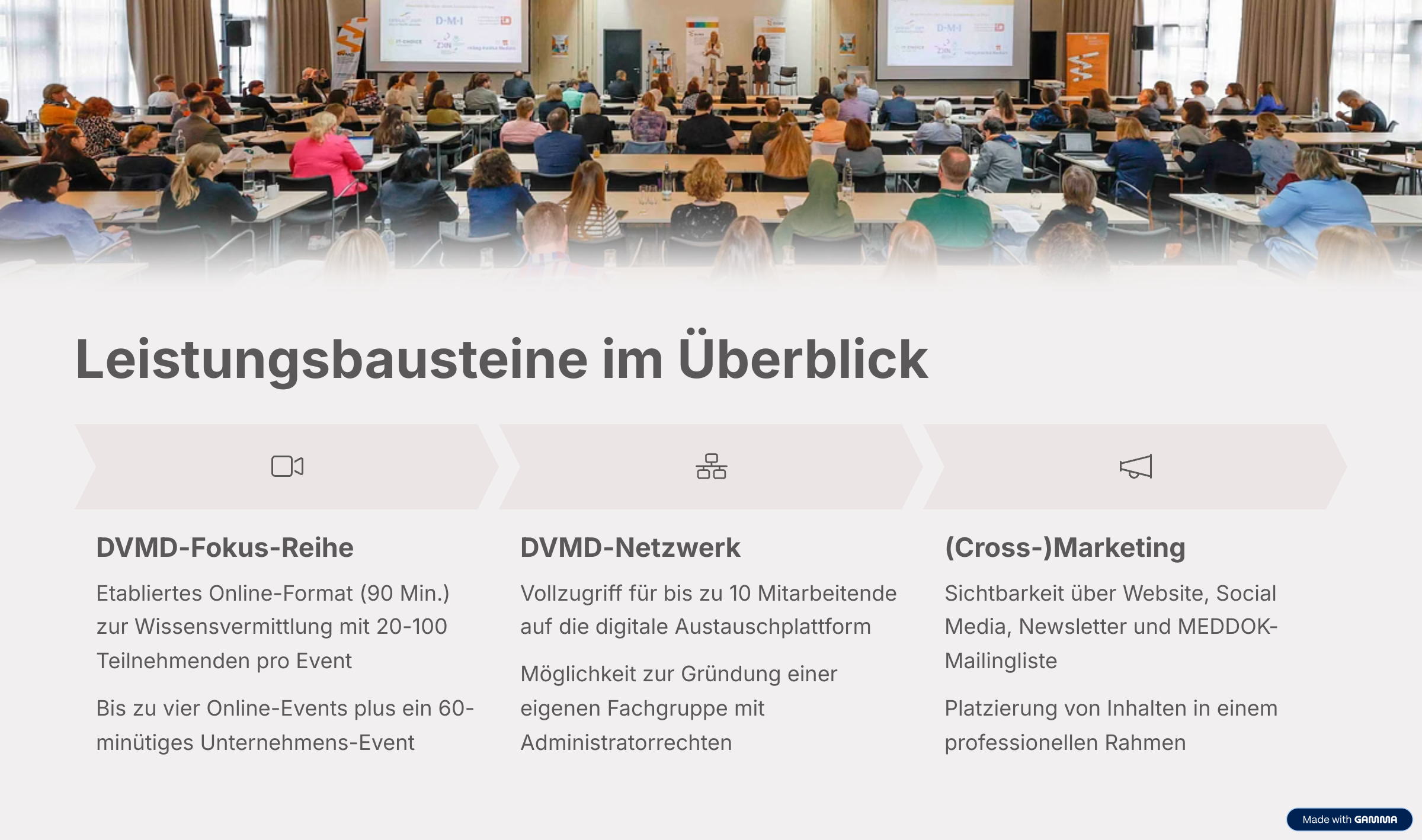 Nutzen Sie das DVMD-Fokus-Format für bis zu vier Online-Events pro Jahr. Zeigen Sie Expertise, stärken Sie Ihre Marke – interaktiv, praxisnah und genau dort, wo Ihre Zielgruppe ist.
